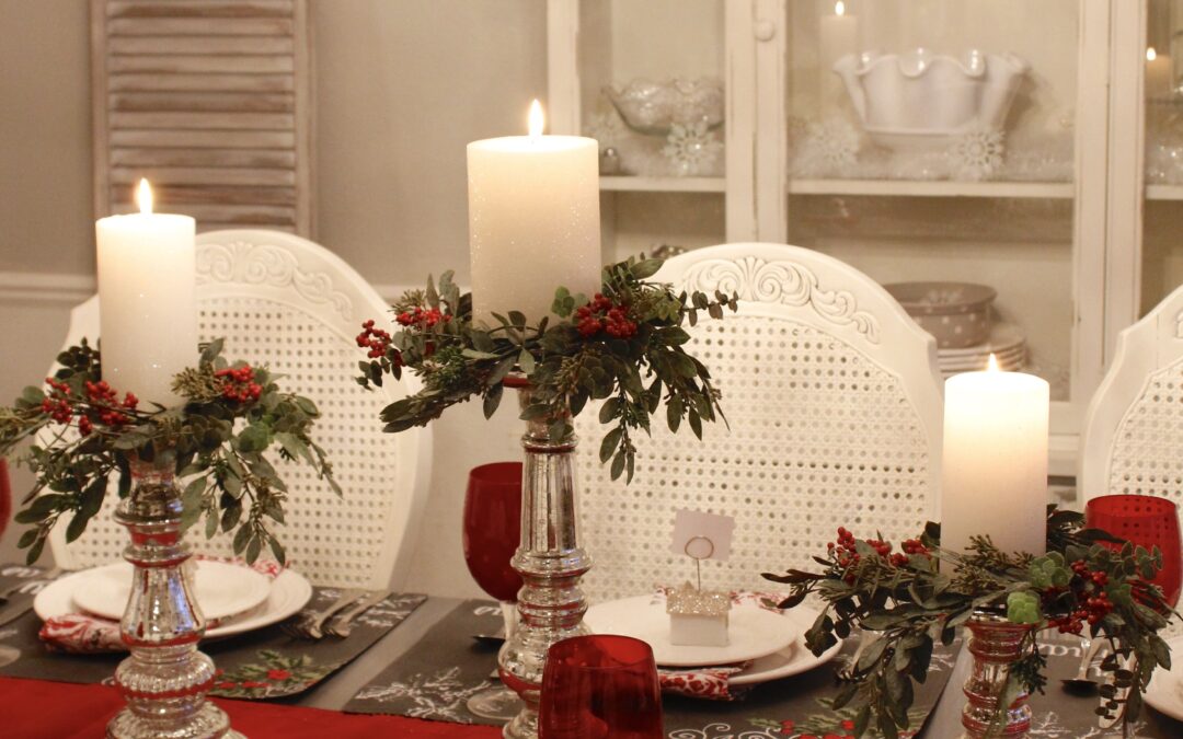 Candles and Lanterns: Arrange pillar or votive candles on a tray with evergreen sprigs, pinecones, or small ornaments for a warm and inviting centerpiece. You can also use battery operated tea lights for safety or longer lasting décor.